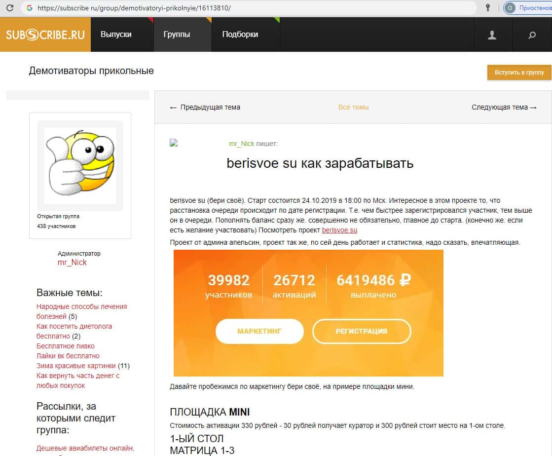 Администратор интернет-ресурса subscribe ru некто mr_Nick анонсирует старт проекта berisvoe, и приглашает всех желающих пойти регистрацию на портале ещё до начала старта проекта, что бы оказаться в выгодном положении на старте. Он считает, что на этом проекте весьма недурно можно будет заработать.