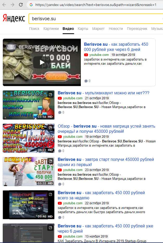 - Обилие рекламных роликов, ищущих рефералов для возврата денег, вложенных в проект Berisvoe su