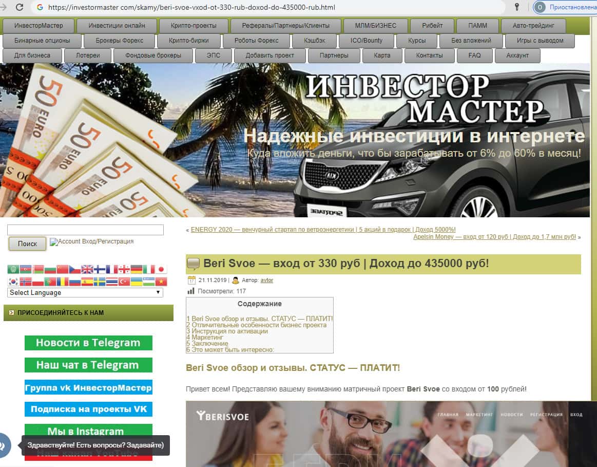 - Хвалебные оды проекту БериСвоё на портале investormaster com