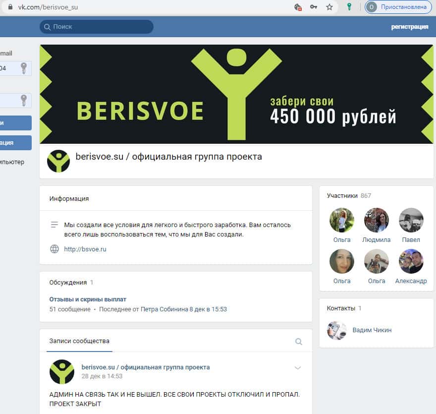 - Сообщение в социальной сети ВКонтакте о скаме проекта БериСвоё су