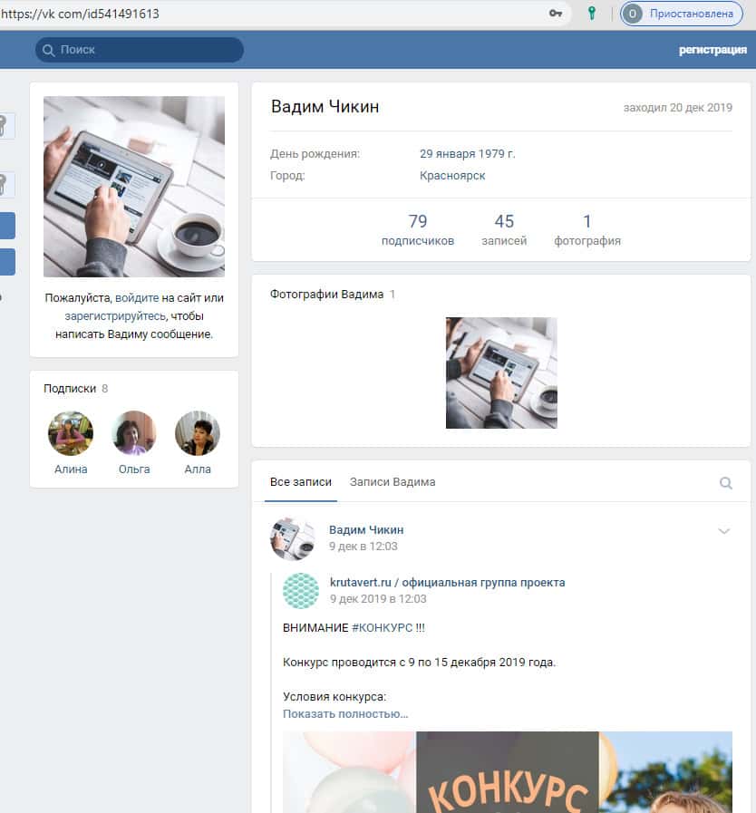 - Страница администратора проекта Berisvoe su Вадима Чикина в социальной сети ВКонтакте