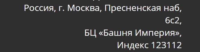 Россия, г. Москва, Пресненская наб, 6с2, БЦ «Башня Империя», Индекс 123112