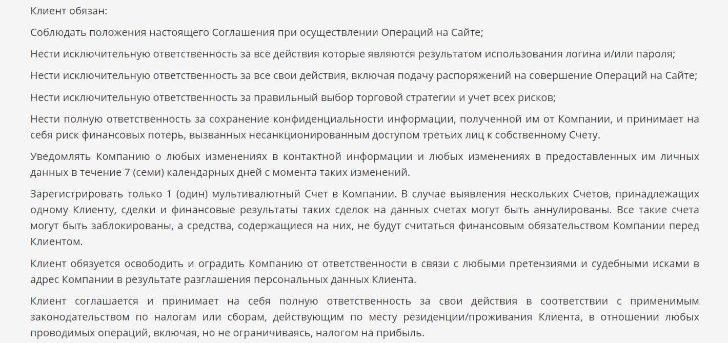 Клиент обязан брать на себя все риски в связи с операциями, производимыми на платформе. Он несет ответственность за выбор торговых стратегий в процессе трейдинга.