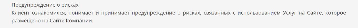 В разделе Предупреждение о рисках контора пишет, что клиент ознакомился, понимает и принимает предупреждение о рисках, связанных с использованием услуг на их сайте.