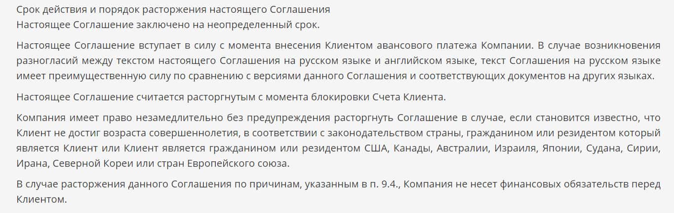 Контора пишет, что настоящее соглашение считается расторгнутым с момента блокировки счета клиента. То есть, они могут забанить счет, а потом присвоить все деньги себе.