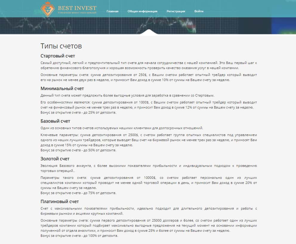 Типы счетов, созданные в компании Best-Invest Co, указывают на то, что брокер - мошенник, так как относится к форекс кухне. Это видно из минимальных размеров депозитов.