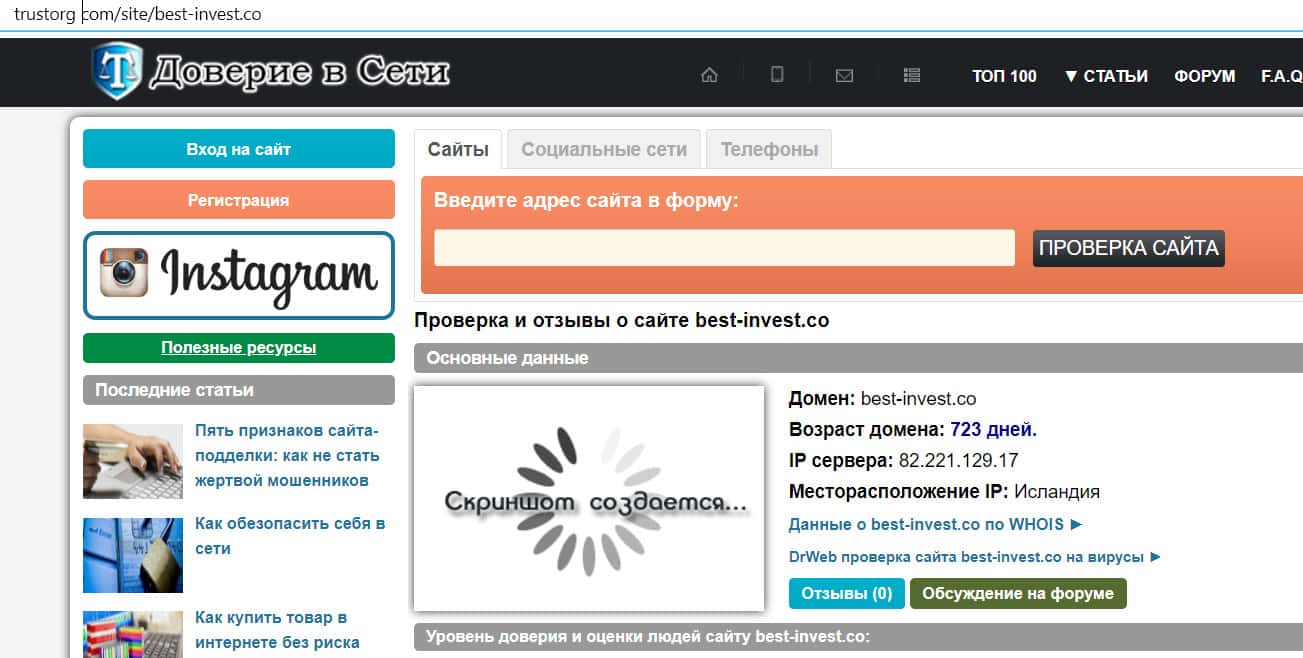 Возраст доменного имени сайта Бест Инвест составляет 723 дня. Эта цифра не совпадает с заявлением на сайте о том, что контора якобы работает с 2016 года.