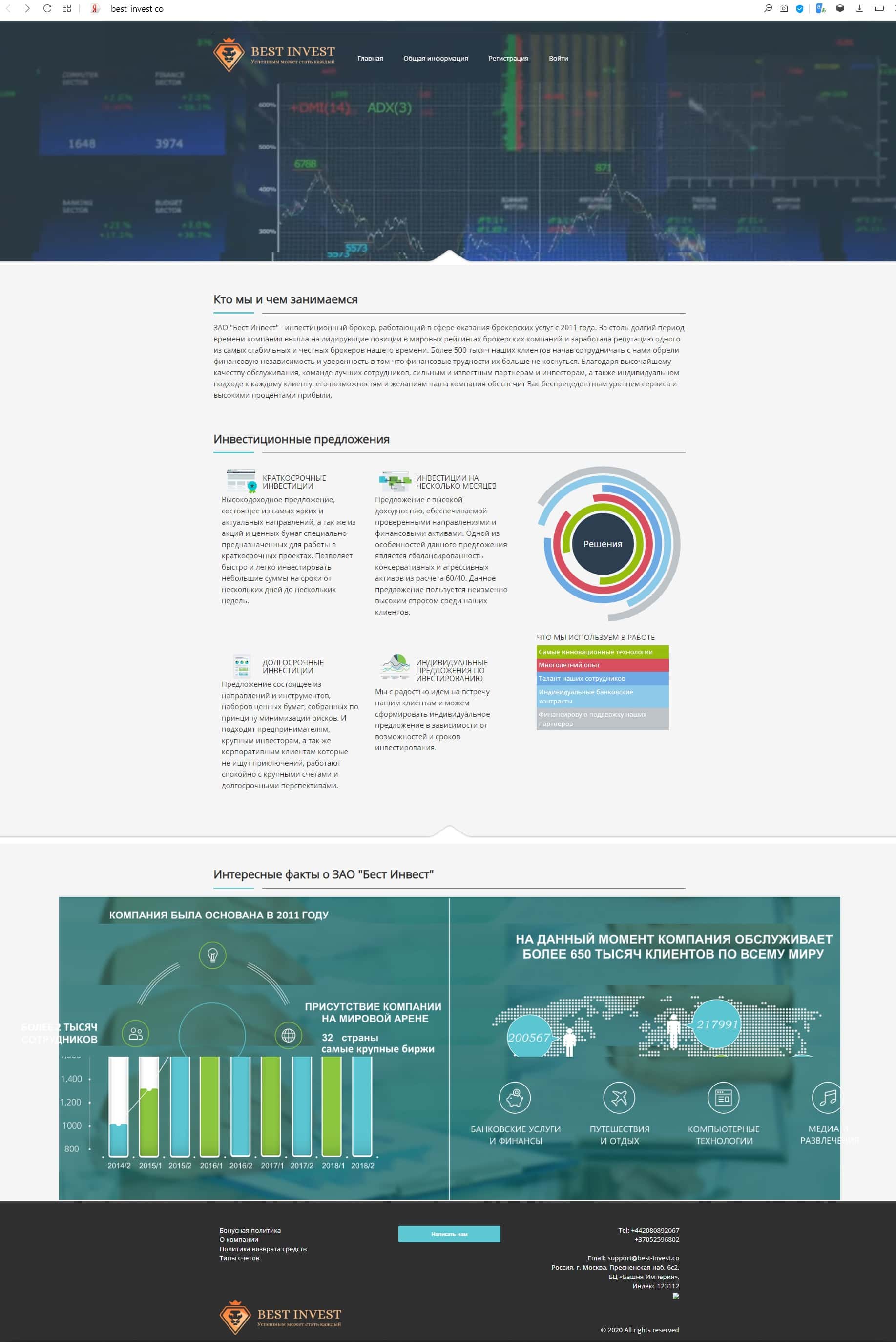 Сайт шулерской компании Бест Инвест сделан под копирку с других лохотронов. На нем нет абсолютно ничего примечательного. Информация о лицензии и руководстве отсутствует.
