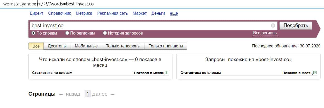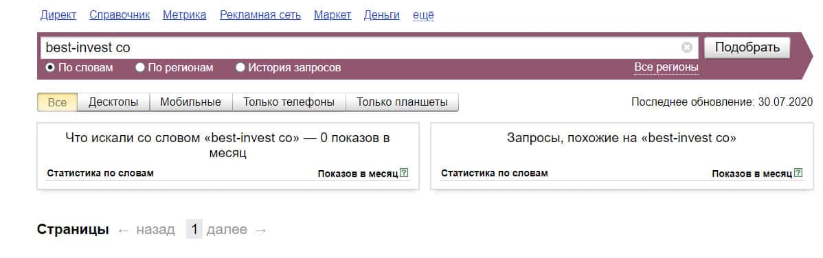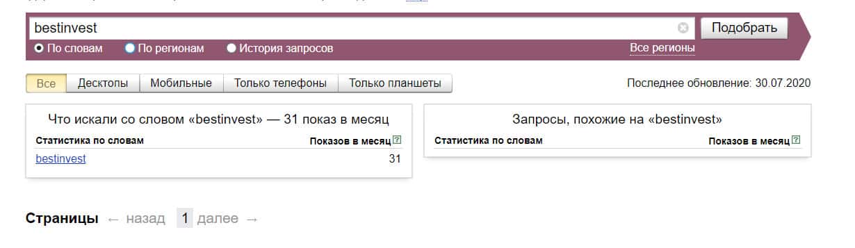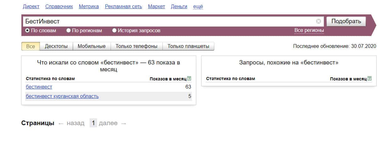 Посмотрим, сколько раз люди искали название бренда "Бест Инвест" на русском языке с пробелом. Незначительное количество раз.