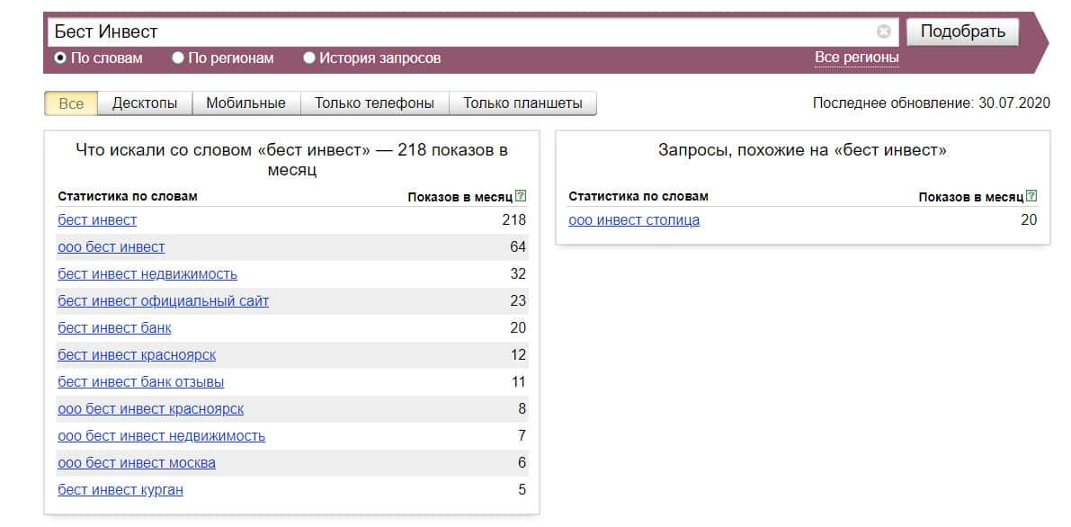 Посмотрим, сколько раз люди искали название бренда "Бест Инвест" на русском языке с пробелом: результат 218 показов.