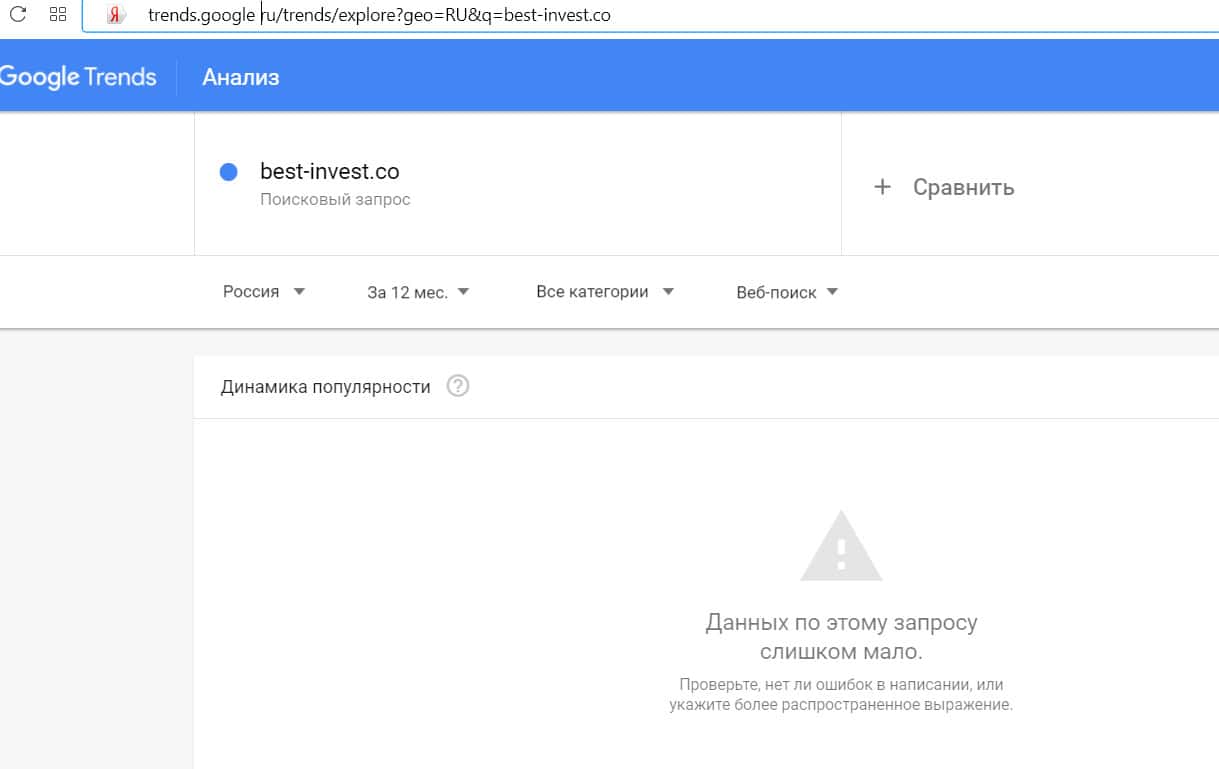 Количество запросов по домену "best-invest co", вбитого в поисковик Гугл без точки, с пробелом, также происходило крайне мало раз.