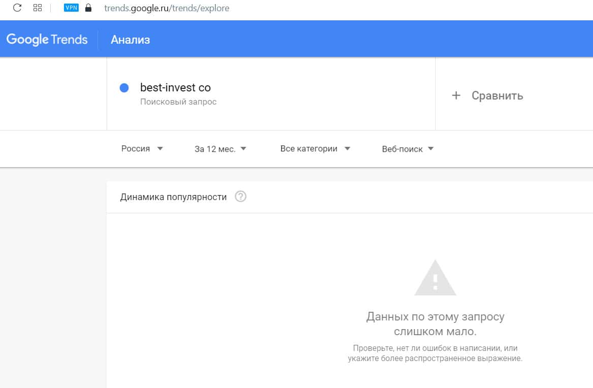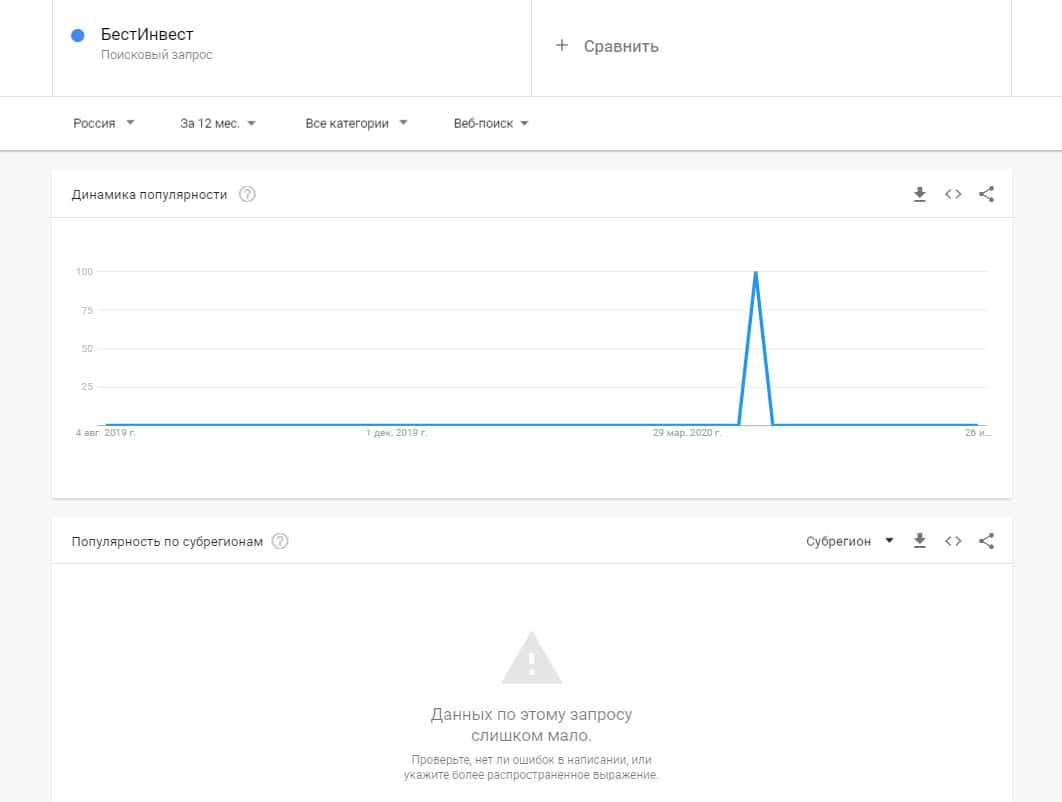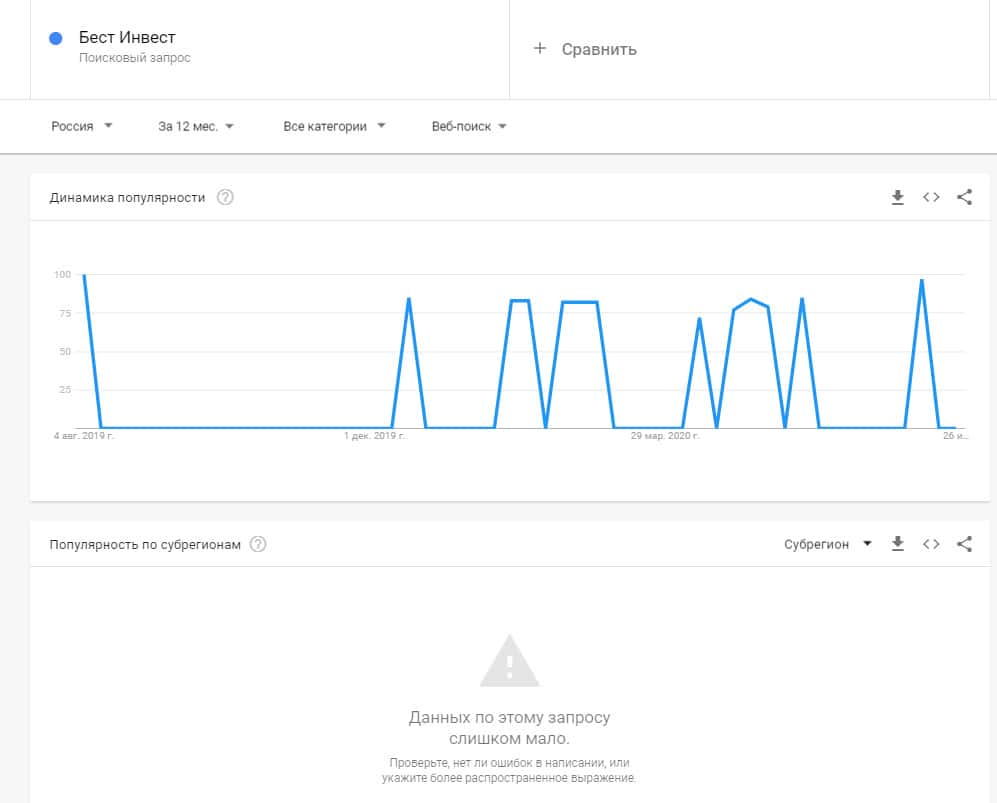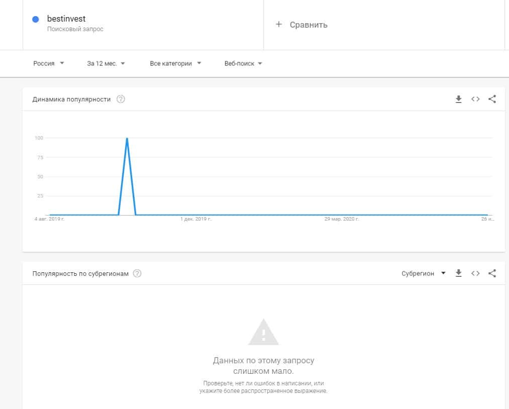 Посмотрим, насколько популярно название бренда "bestinvest", написанное на английском языке. Данных по этому запросу нет, так как никто не искал этот бренд в Гугл.