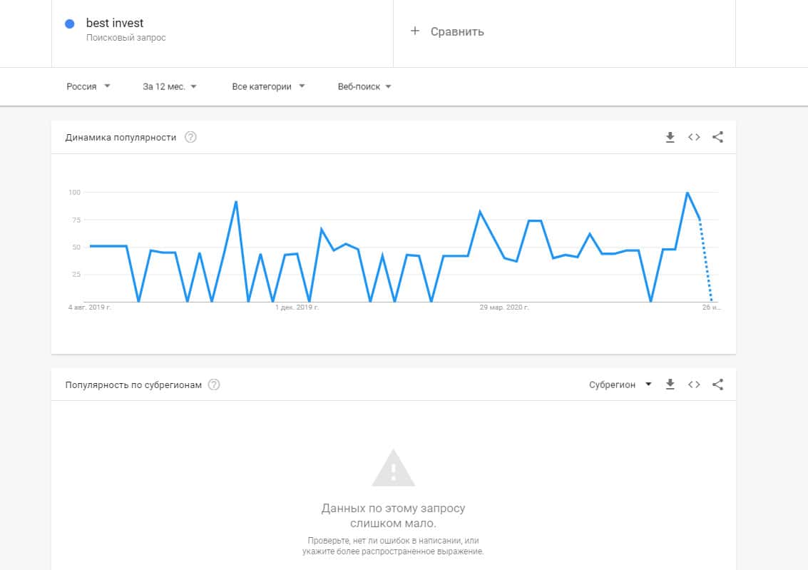 Если вбить то же название на английском языке, но с пробелом - "best invest", результат поиска будет таким: очень мало данных.
