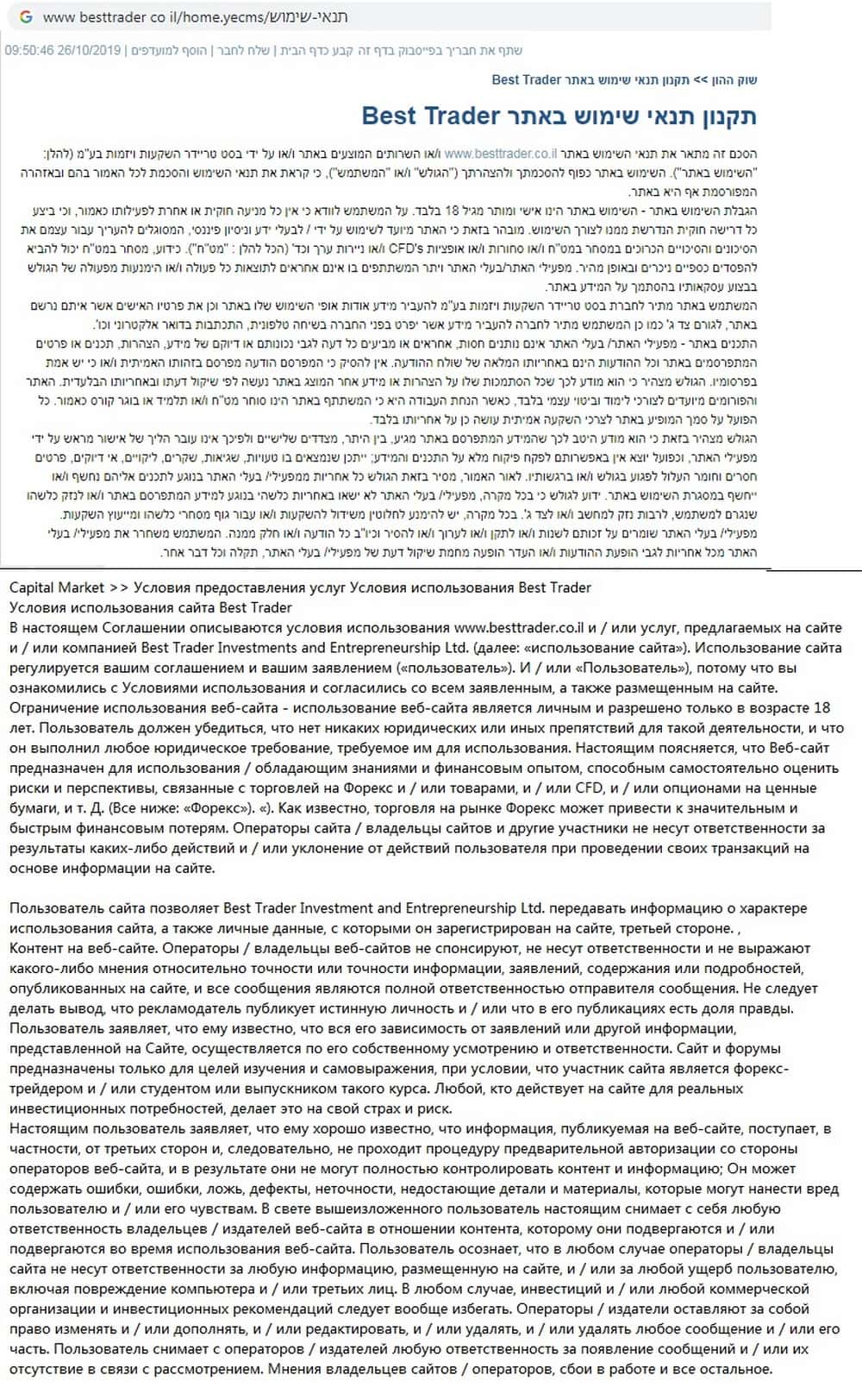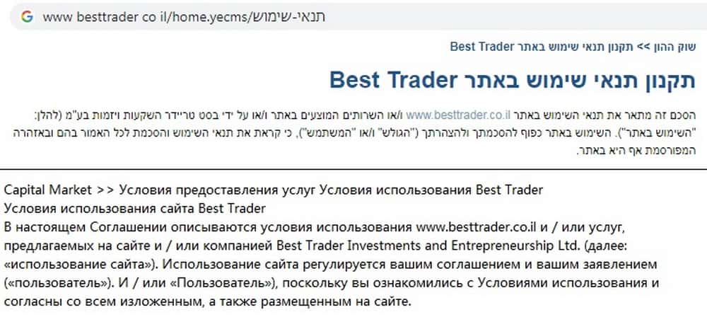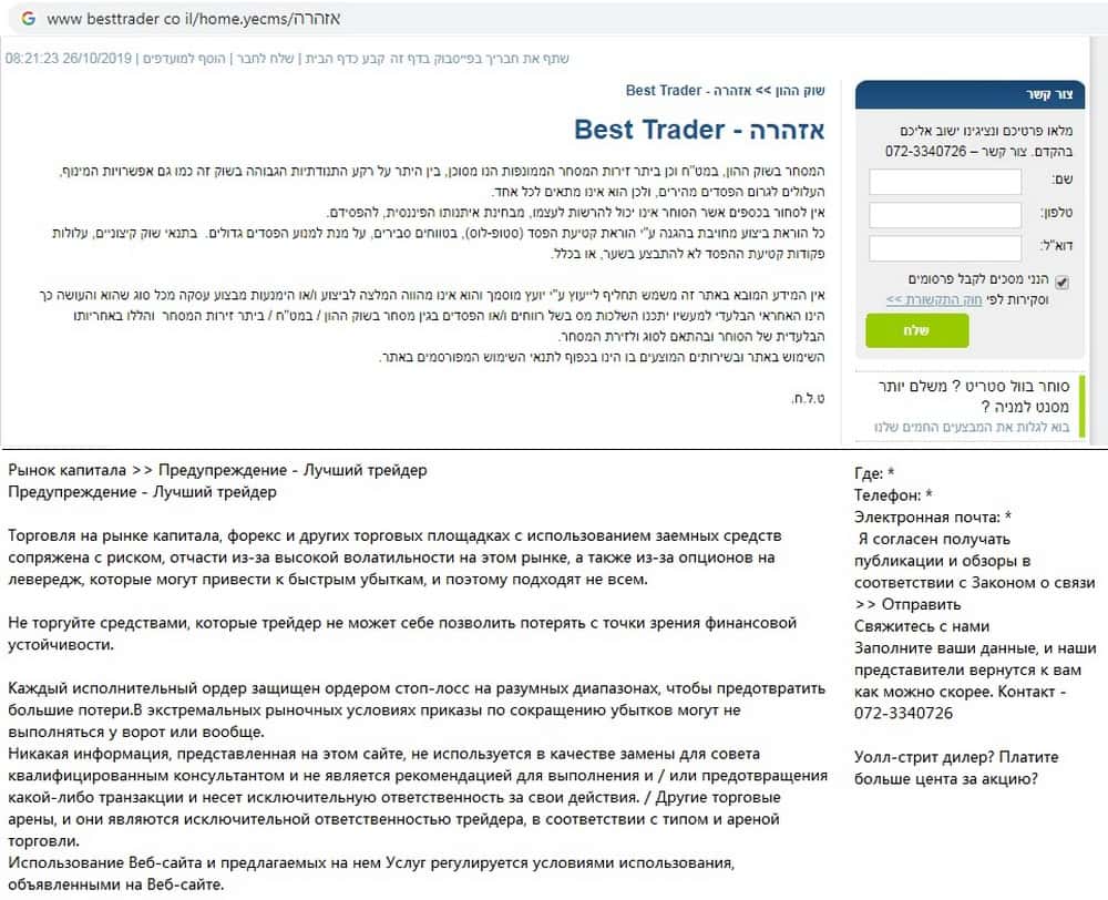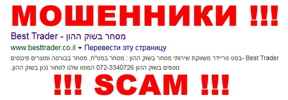 Best Trader - представитель кидаловских контор, лживо выдающих себя за брокеров, базирующийся в Израиле. Данная организация представляет собой лохотрон, куда доверчивый пользователь может лишь вложить деньги, но никак не вывести их обратно. Здесь нагло обворовывают вкладчиков, оставляя их бомжами.