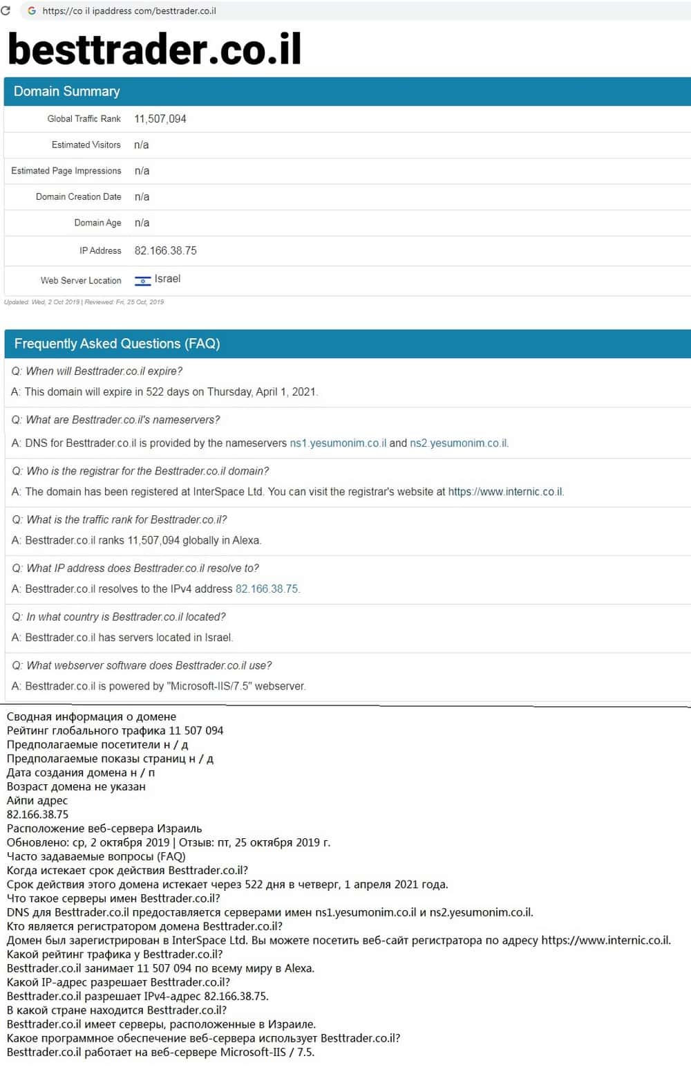 Не очень много света на подозрительную контору Бест Трейдер проливает информация о домене - большинство данных заблокировано, в том числе и возраст домена. Становится понятным лишь то, что проходимцы, действительно, базируются в Израиле, а срок их действия истекает в 2021 году.