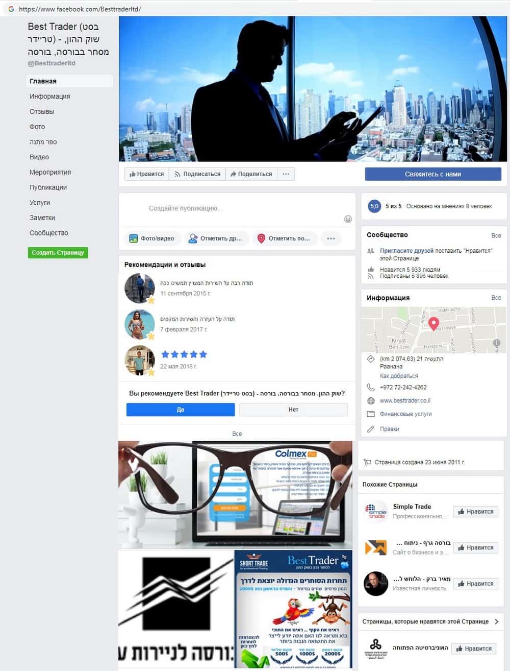 Социальные сети - популярнейшее место, где всякие мошенники, типа хайпа Best Trader, ловят наивных жертв. Заманивая юзеров в свои сети заманухами в виде шикарной прибыли в ходе торговли бинарными опционами, пройдохи затем просто сливают реальные деньги на свой счет. Их аккаунт на Фейсбук выглядит так.
