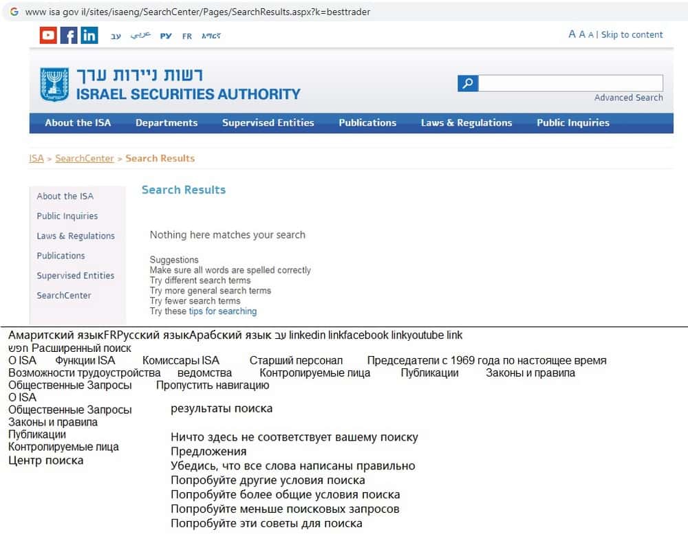 Как и ожидалось, лицензировать деятельность фальшивой конторы Бест Трейдер, только и занимающейся разводом и кидаловым обычных граждан, никто не собирается. Не отыскав инфы о лицензии на портале жуликов, обратимся к официальному израильскому регулятору брокеров. Естественно данного хайпа в базе нет.