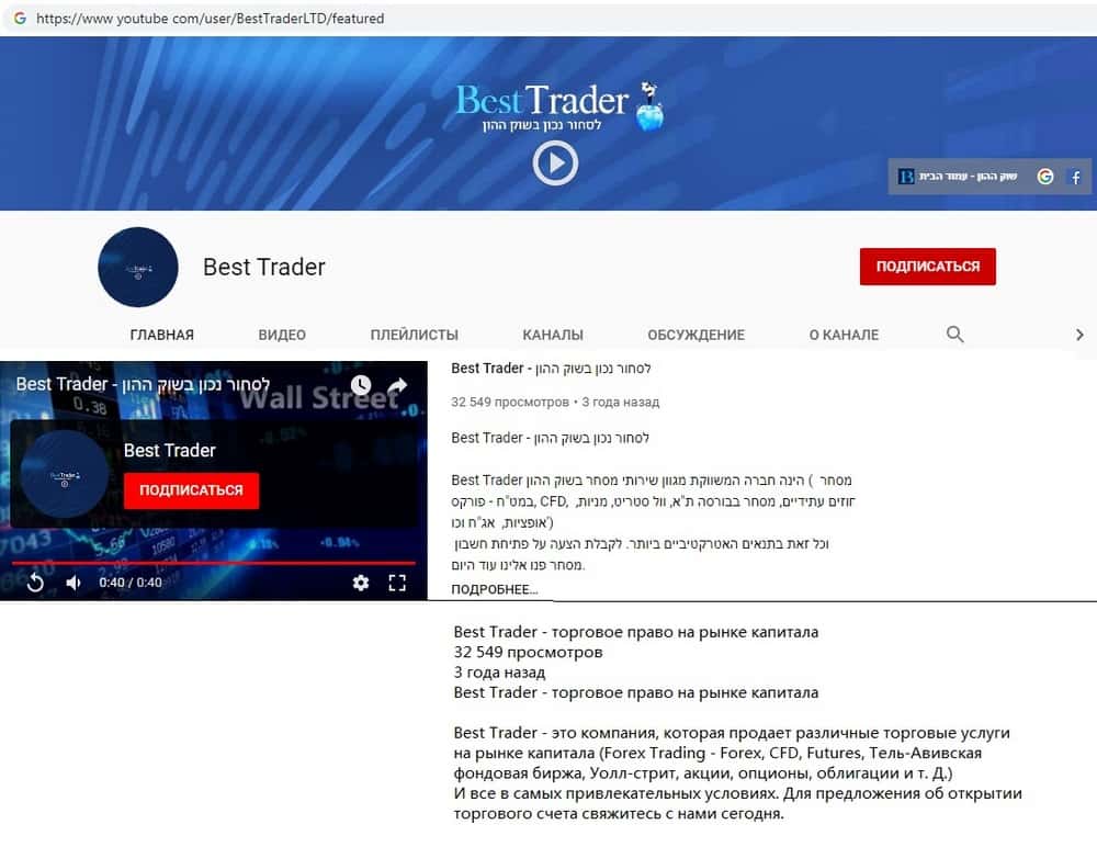 Не поленились скаммеры Best Trader создать канал и на Ютубе, где тусуется огромное количество пользователей, являющихся потенциальными жертвами данного лохотрона. Видно, дела в последнее время идут у конторы не очень, так как публикации здесь устарели - последняя была сделана аж 3 года назад.