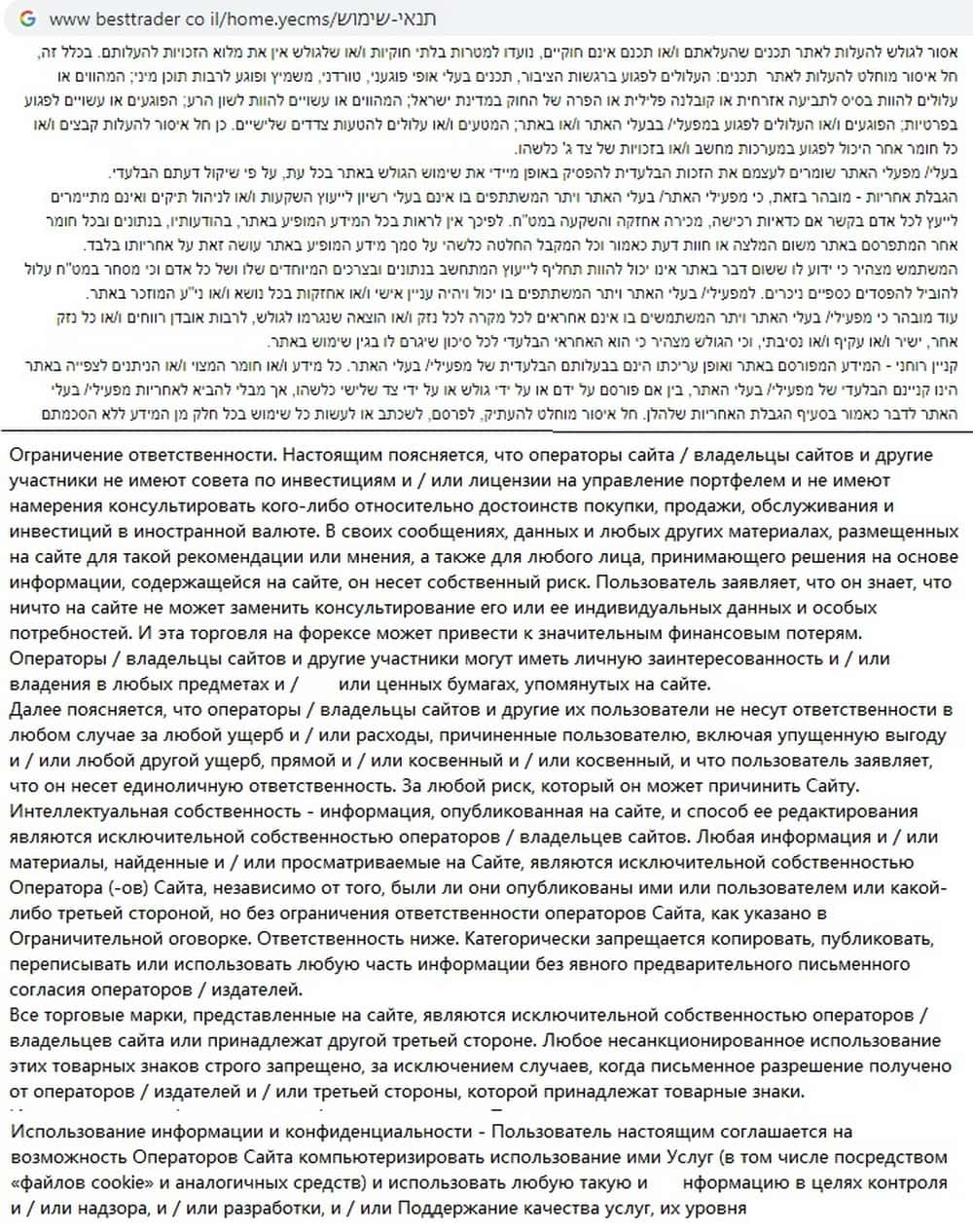 Вместо обычного соглашения, пользователю скаммерского портала Best Trader предлагается изучить условия пользования платформой. Здесь жулики разошлись на всю катушку. Клиент сразу предупреждается, что возможны денежные потери, отвечать за которые будет только он сам.