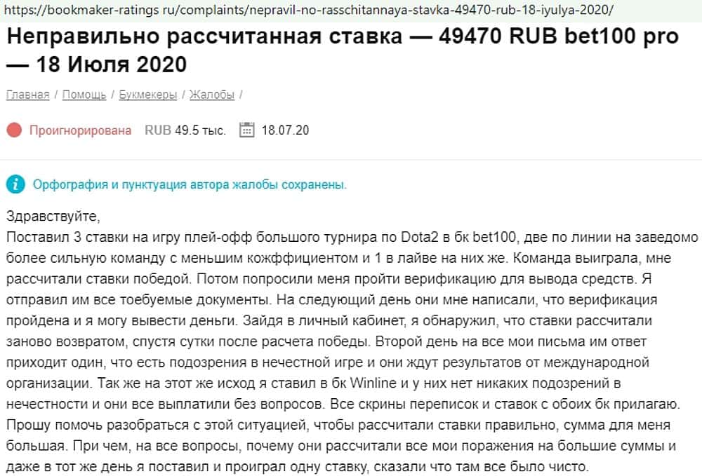 Каталы Бет 100 жульничают со ставками своих клиентов