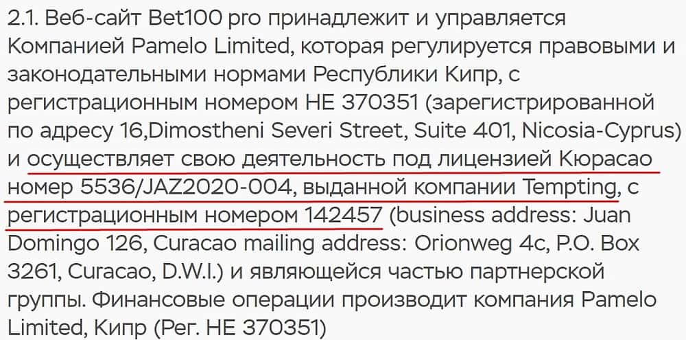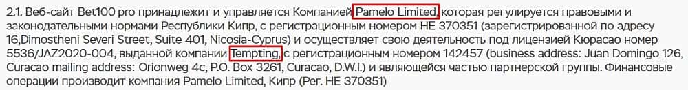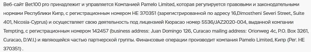 По словам гэмблинг-мошенников Бет 100, их помойка управляется двумя компаниями, одна из которых это Pamelo Limited из Кипра, а вторая Tempting из оффшорной дыры Кюрасао.