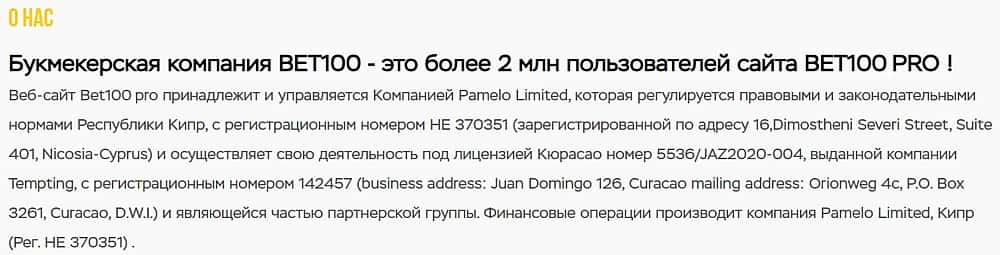 В разделе "О нас" сайта шулеров bet100 pro никакой информации о руководстве шараги не обнаружилось. Только некая юридическая информация, которая еще и довольно сомнительна.