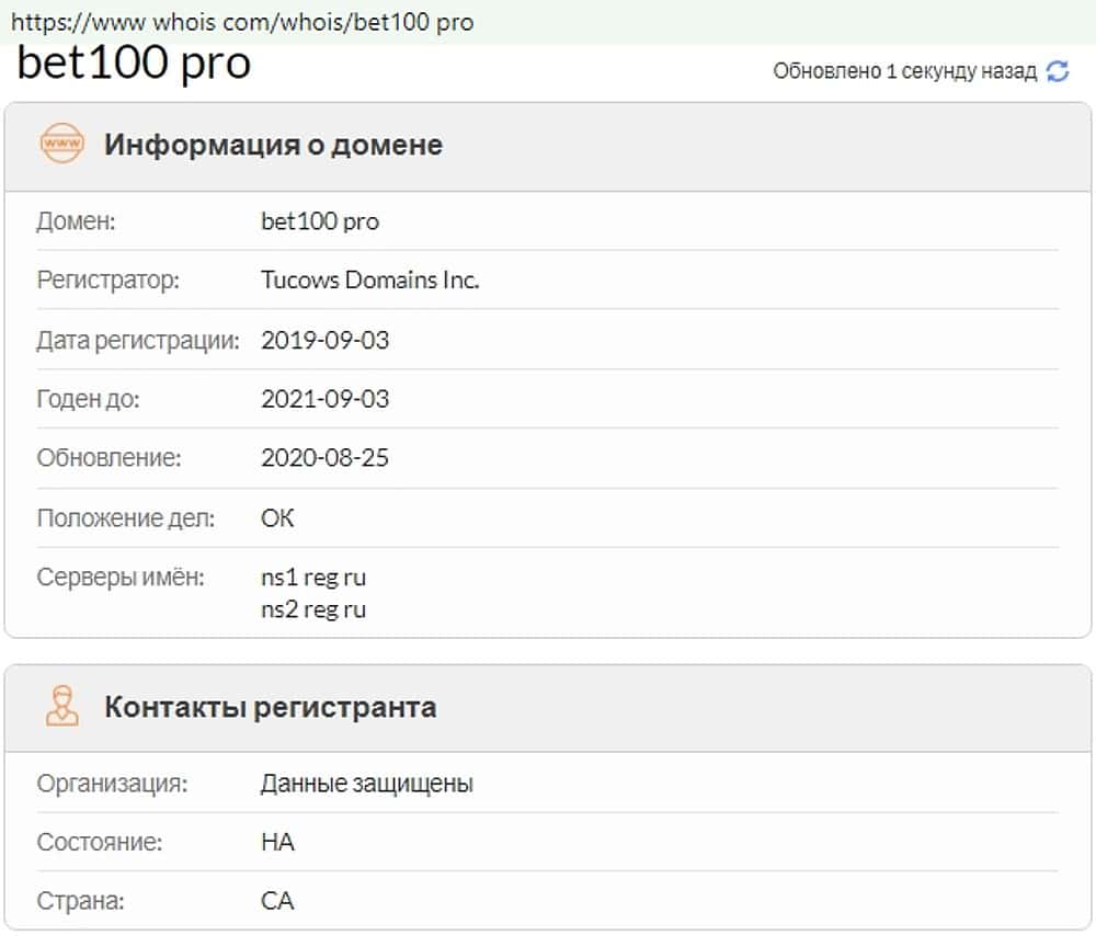 Хозяин домена, который хапуги прикрутили к своему недосервису Бет 100, предпочел воспользоваться сторонней веб-службой для сокрытия личных данных, как все мошенники.