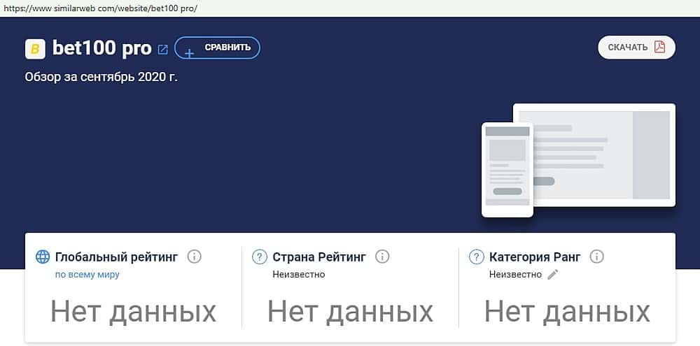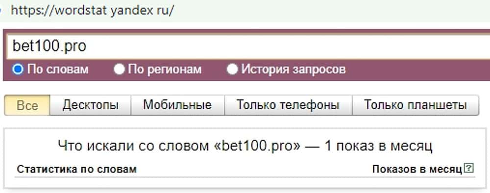 Страну лохотрония по запросу "bet100.pro" искали всего один раз. Мошенники, мухлюющие со ставками на спорт, не имеют популярности своего гнилого сайта у пользователей Яндекса.