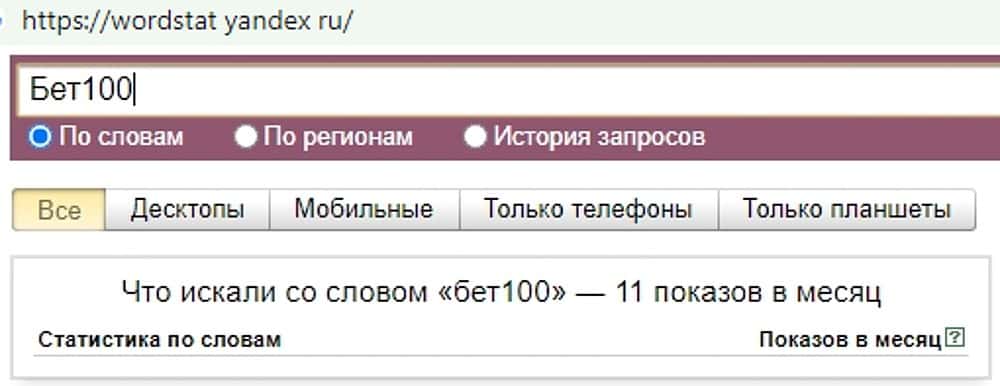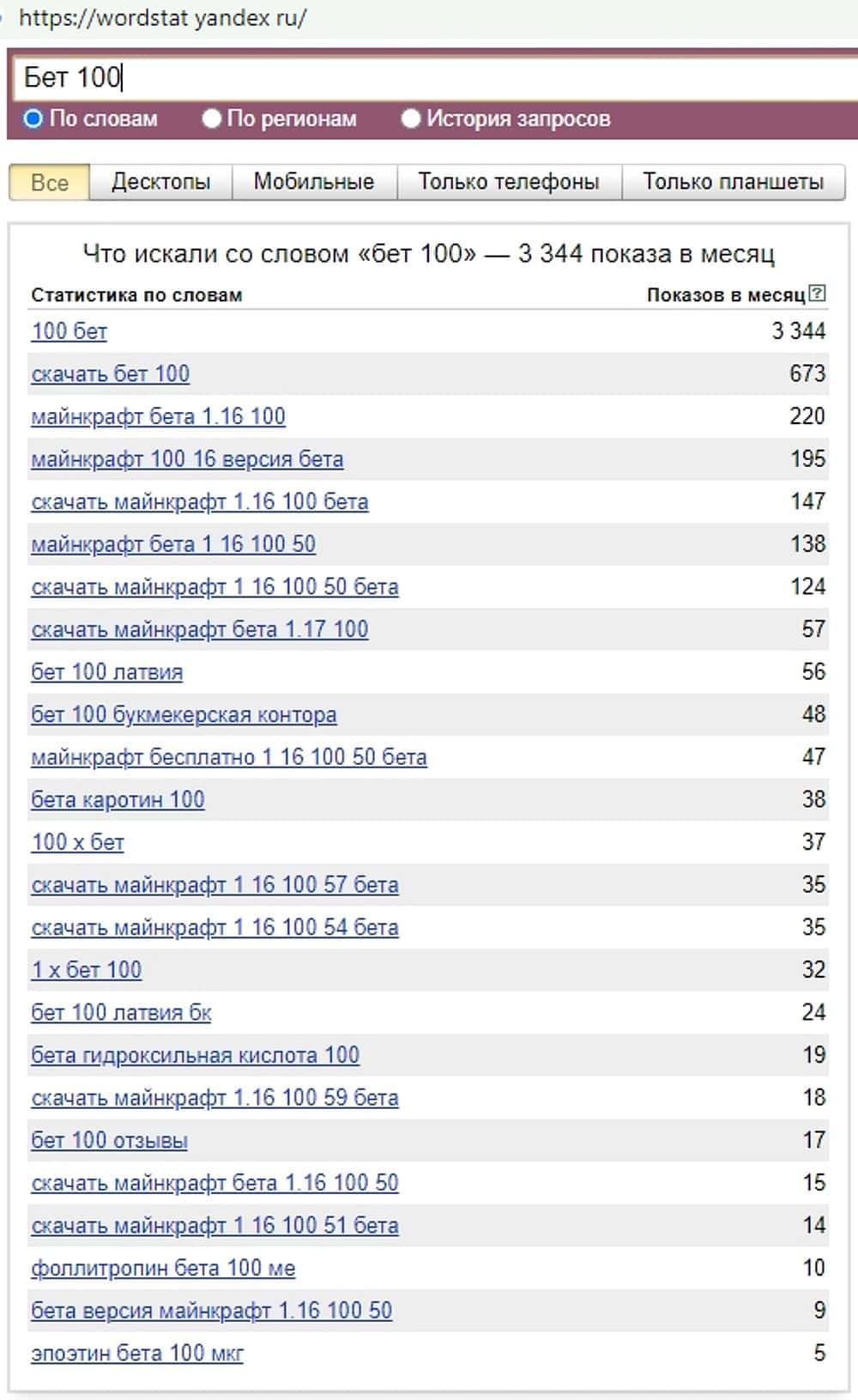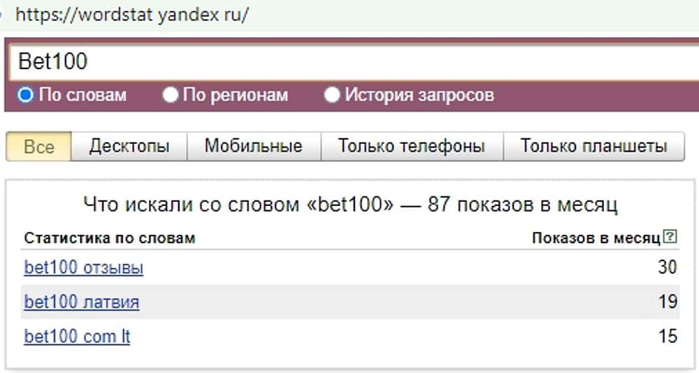 Фраза "Бет 100" в поисковой строке веб-комплекса Яндекс присутствовала 3344 раза, но здесь можно заметить, что не все искали данную аферу вместе с этим поисковым запросом.