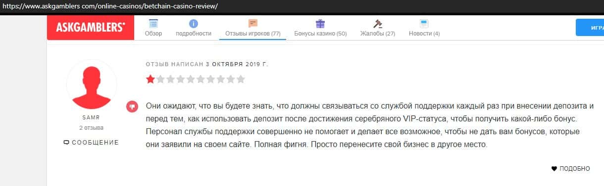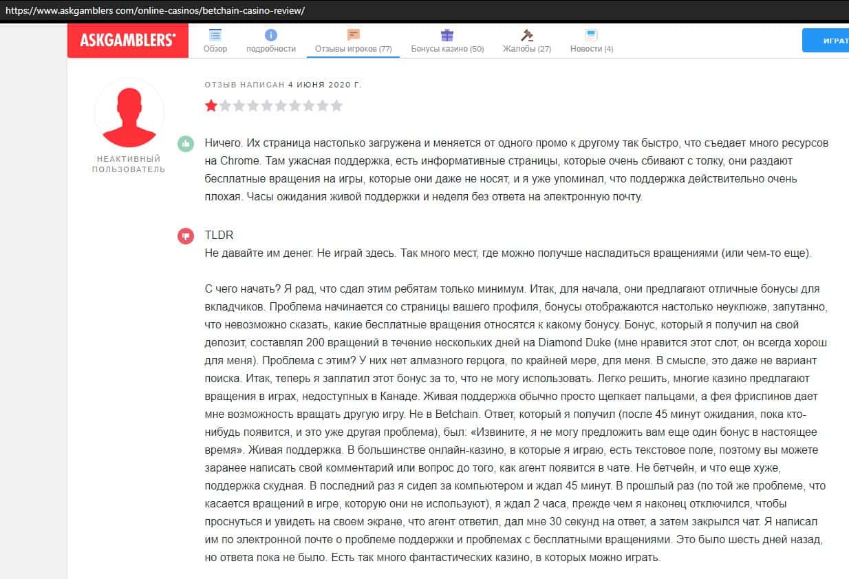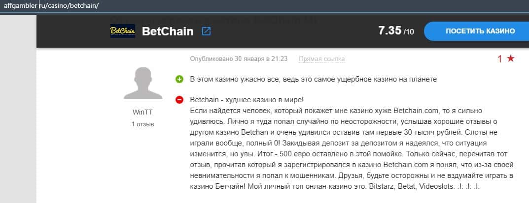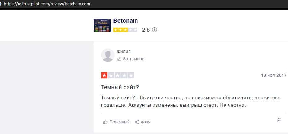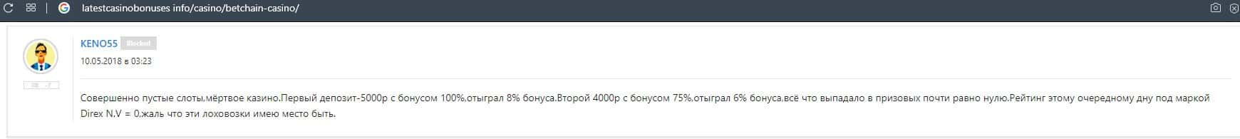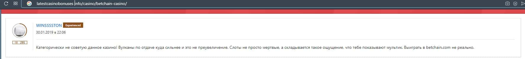 Далее представлен отзыв в котором клиент рассказал о лохотронском казино BetChain. Он там лишился порядка 500 евро и теперь никакому не советует связываться с ними.