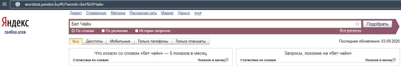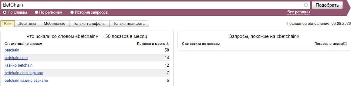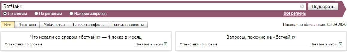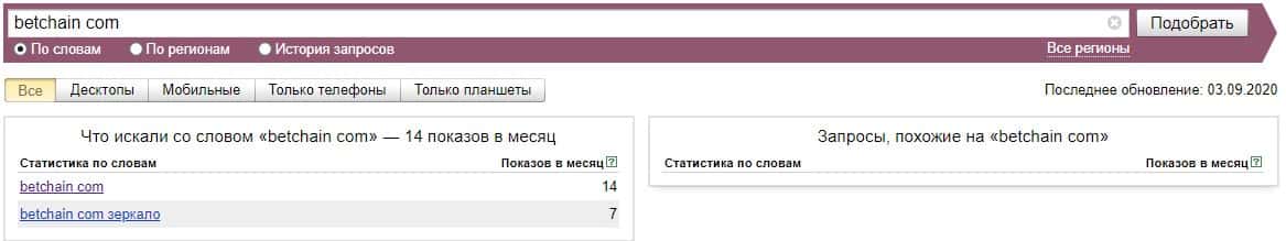 Если взять и пробить в Яндекс.Вордстат чисто домен сайта без точки "betchain com", то система выдает нам 14 показа в месяц.