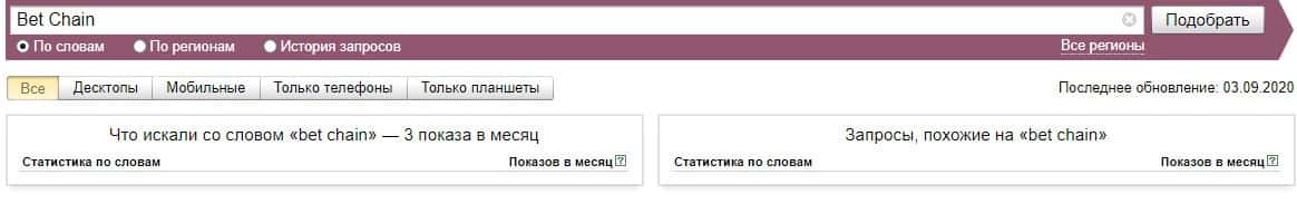 Что касается бренда "Bet Chain", то здесь ситуация также плачевная и Яндекс Вордстат смог обнаружить только 3 показа за последний месяц.