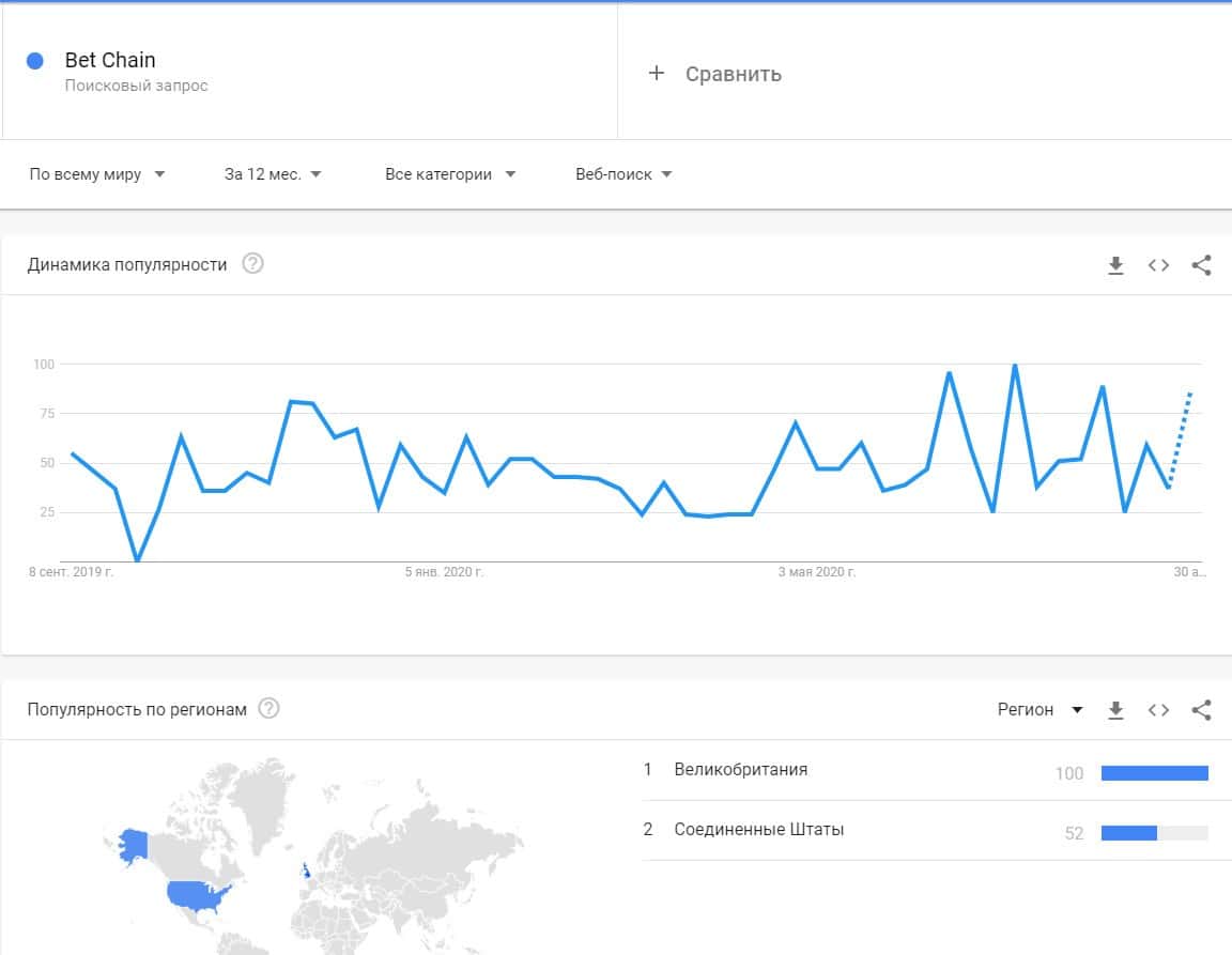 Касательно бренда "Bet Chain" по Гугл Трендс и сказать также есть что, так как мошенническая организация была замечена в Соединенных Штатах Америки и Великобритании.