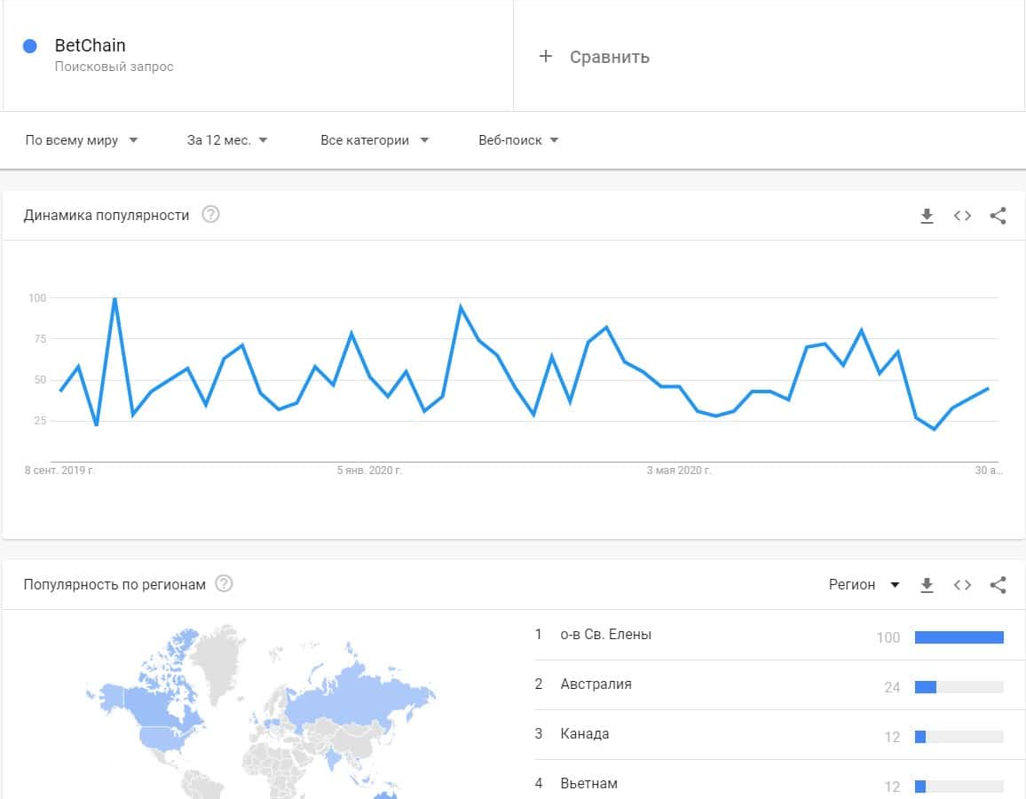 Далее представлена статистика по бренду "BetChain", которая популярна средне и запросы в Гугл в основном исходили из острова Св. Елены, Австралии, Канады и Вьетнама.
