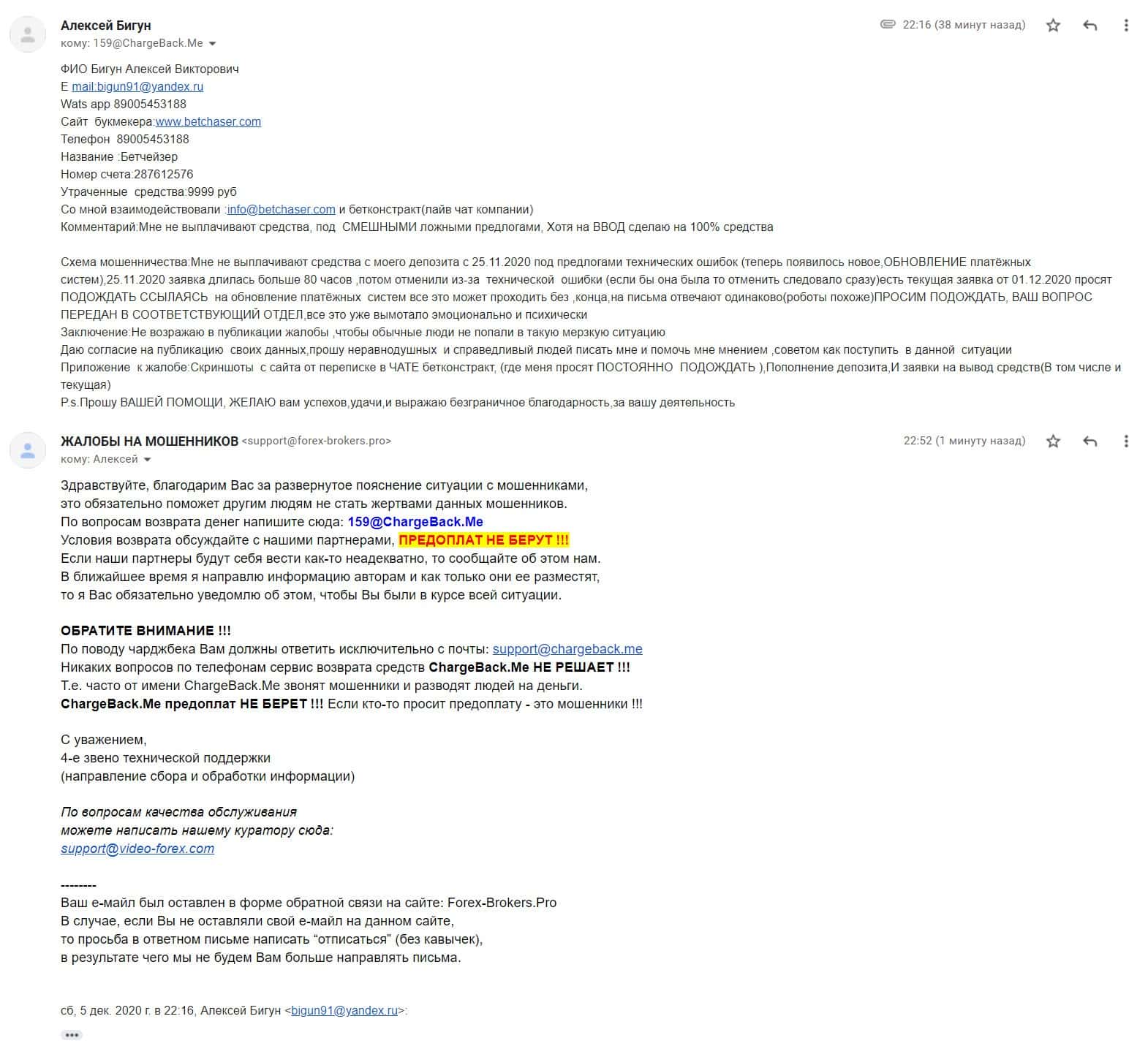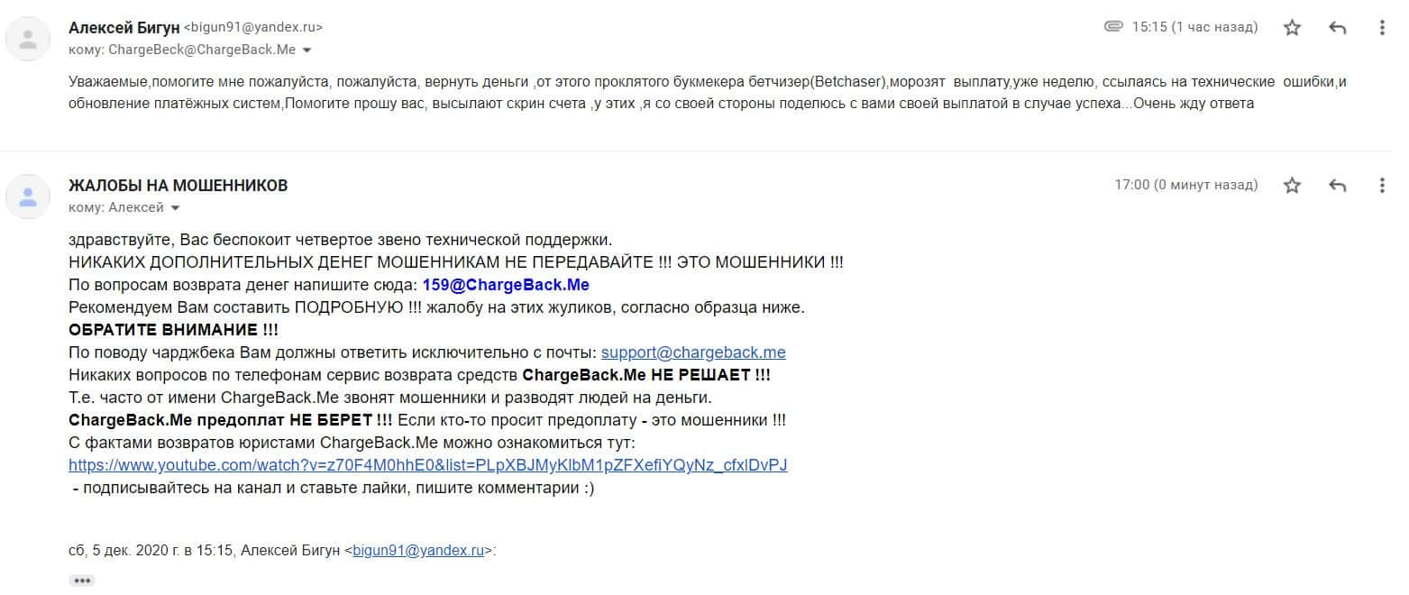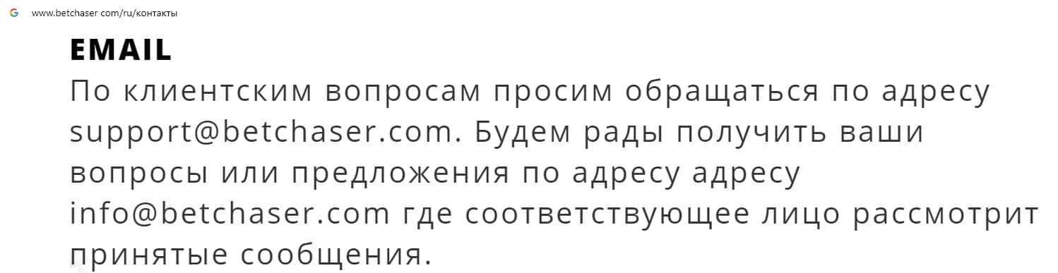 Обманщики Bet Chaser на своем официальном интернет-ресурсе указывают адрес электронной почты, а именно: