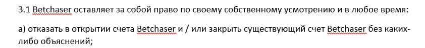 Мошенники Bet Chaser вправе отказать пользователю в открытии счета не объясняя причин, что является признаком интернет-лохотрона.