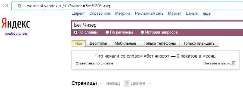 Количество запросов по бренду названия компании на русском языке "Бет Чизер" на Яндекс Вордстарт вероятно равно нулю.
