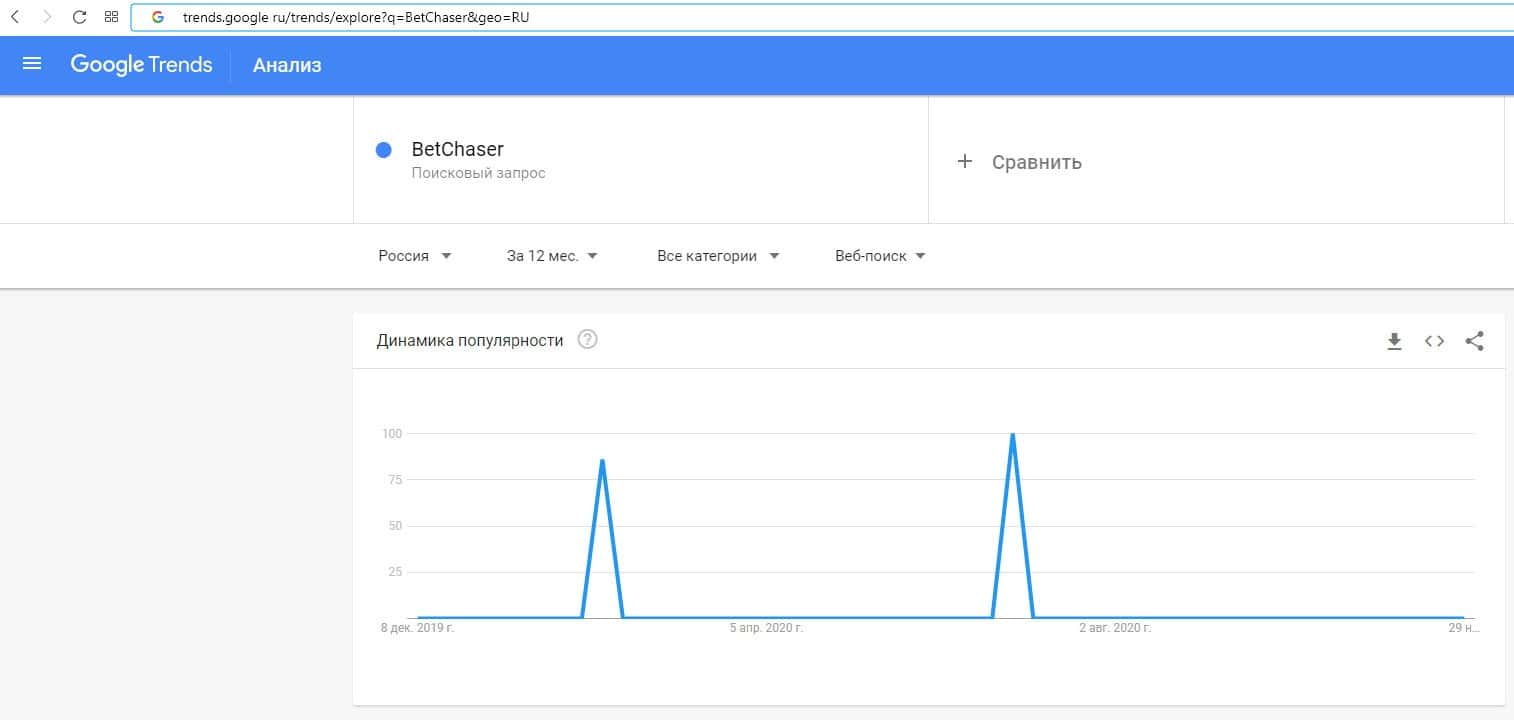 Динамика по количеству запросов по бренду англоязычного названия компании "BetChaser" на Гугл Трендс отображена на графике ниже.