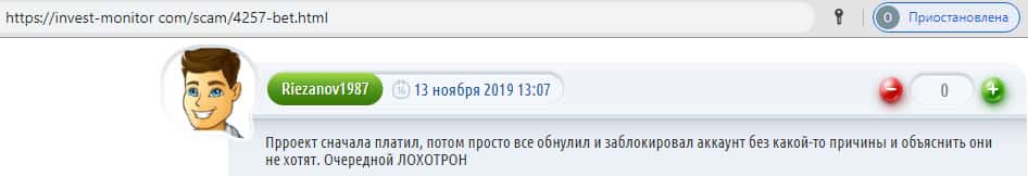 Пользователь Riezanov1987, оставивший свой отзыв о проекте БетИнвест лтд на портале invest-monitor com, пришел к выводу, что инвестиционная компания БетИнвест лтд является ни чем иным, как очередным лохотроном. Первые выплаты он получил, а затем его счет на БетИнвест был обнулен, и впоследствии заблокирован аккаунт без каких-либо объяснений.
