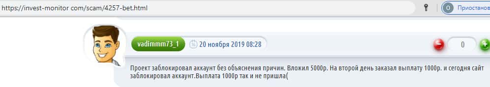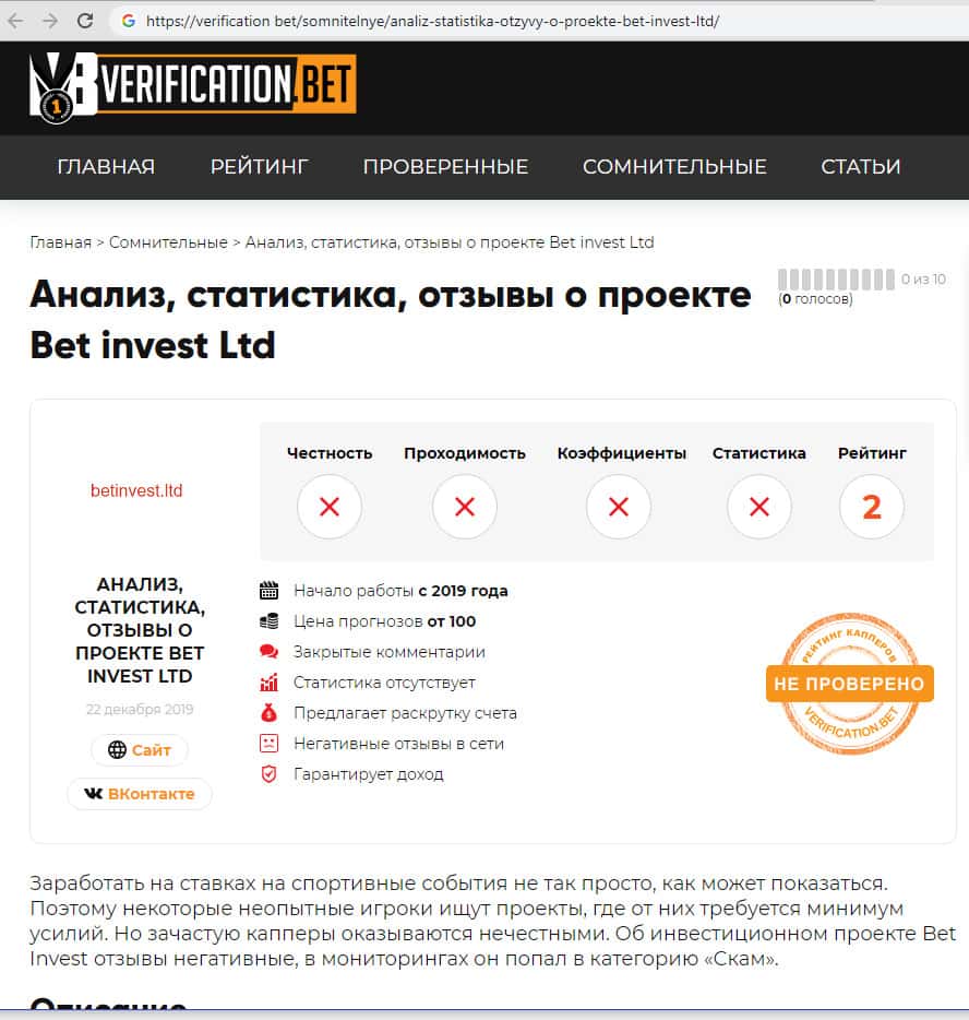 - Абсолютное отсутствие доверия к проекту БетИнвест на портале verification bet