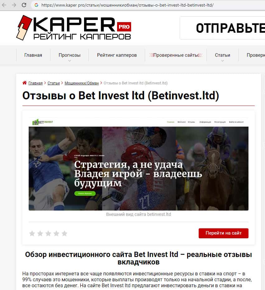 На портале kaper pro, посвященному инвестициям в ставки на спортивные поединки, прогнозам и компаниям связанным с ними, размещен обзор портала БетИнвест Лтд и его деятельности. В обзоре сказано, что это очередной хайп проект, где проценты уже перестали выплачивать, а счета клиентов просто блокируют, чтобы те не смогли вывести свой депозит.