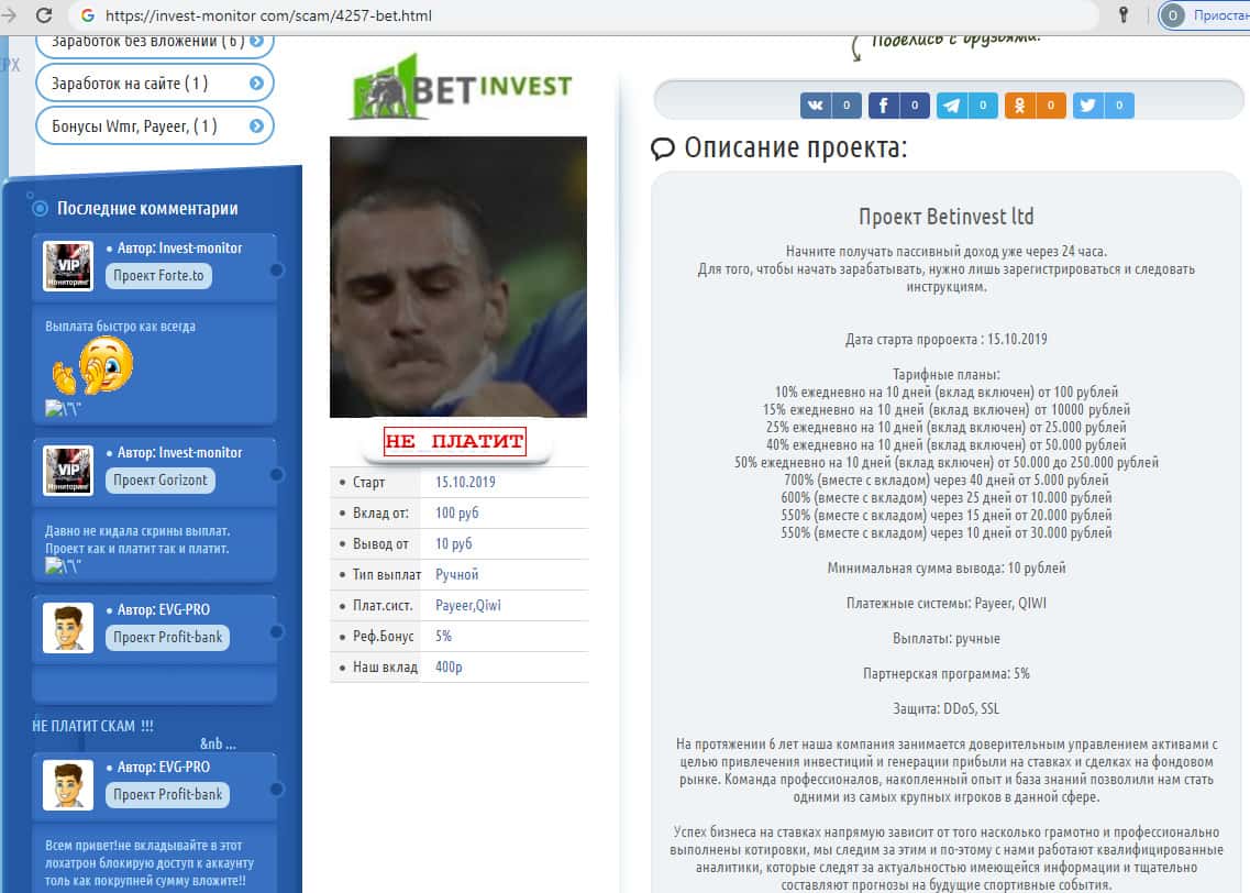 - Сообщение о скаме проекта БетИнвест на портале Быстрые хайпы