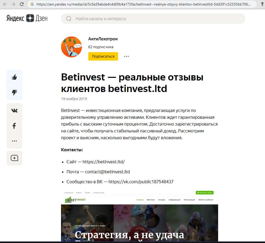 - Разоблачение каналом АнтиЛохотрон проекта БетИнвест на яндекс дзен