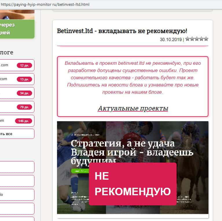 Автор блога на ресурсе paying-hyip-monitor ru не рекомендует вкладывать в проект betinvest ltd, он считает, что при разработке портала БетИнвест были допущены существенные ошибки. Он не рекомендует инвестировать в проекты с не уникальным дизайном и контентом, а так же, в проекты без лицензионного скрипта и с бесплатным ssl сертификатом.