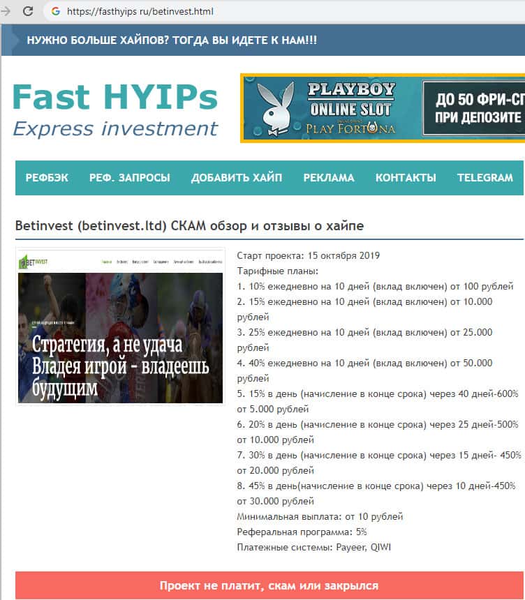 На портале fasthyips ru, рекламирующем доступные хайп-проекты в сети интернет, нашлось немного места и проекту БетИнвест лтд. Обзор содержит краткую информацию по доступным тарифным планам на проекте БетИнвест, предлагающем подъем от десяти до сорока процентов ежедневно в зависимости от размера инвестиций и прискорбное или же долгожданное сообщение об общем скаме проекта.