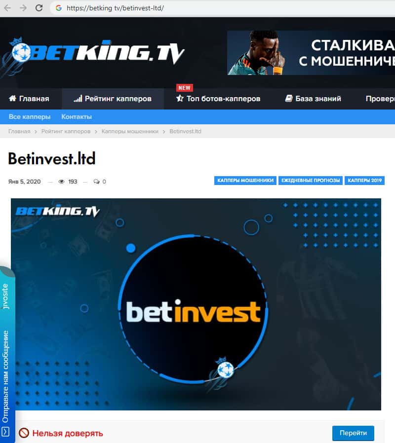 На портале verification bet, посвященному ставкам в спорте и всем видам заработка на спортивных состязаниях проведено расследование деятельности проекта БетИнвест лтд, и опубликованы выводы: "Доверие к проекту отсутствует полностью, нет никакой гарантии, что ставки действительно делают, что они имеют высокие коэффициенты и проходимость."
