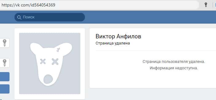 Страница так называемого администратора проекта, Виктора Анфилова в социальной сети ВКонтакте удалена.