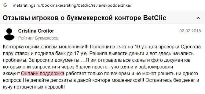 Далее предоставлен коммент об уровне обслуживания со стороны букмекерской конторы BetClic, которая обманывает людей на деньги.