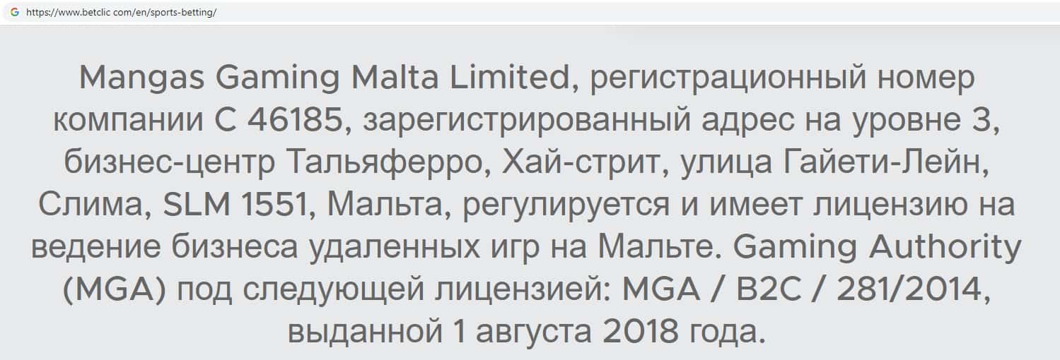 Юридическое лицо Mangas Gaming Malta Limited владеет мошенническим онлайн-сервисом betclic com, компании Бет Клик, у которой оффшорная регуляция.