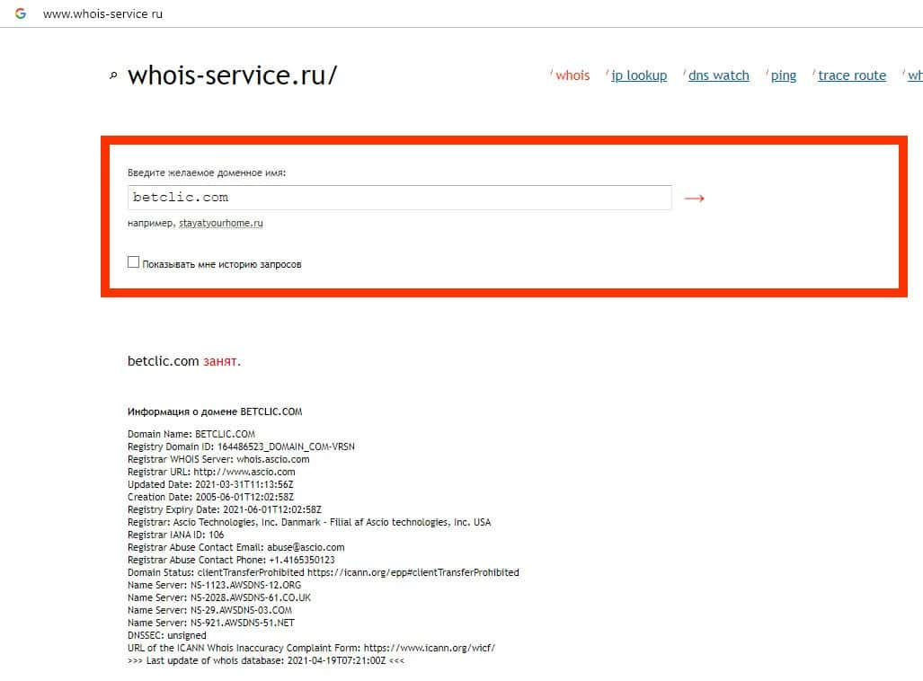 - Информация о возрасте домена скам-конторы BetClic
